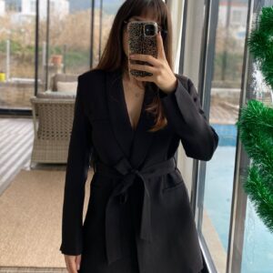 Kadın İkili Kuşaklı Blazer Ceket Pantolon Takım Siyah