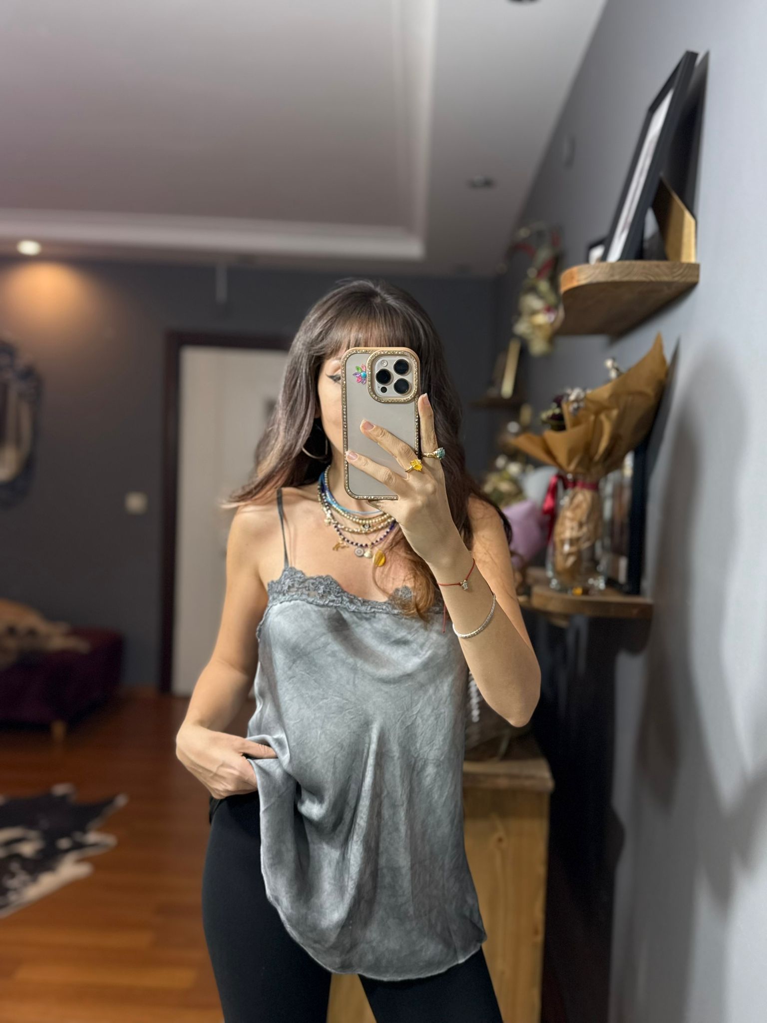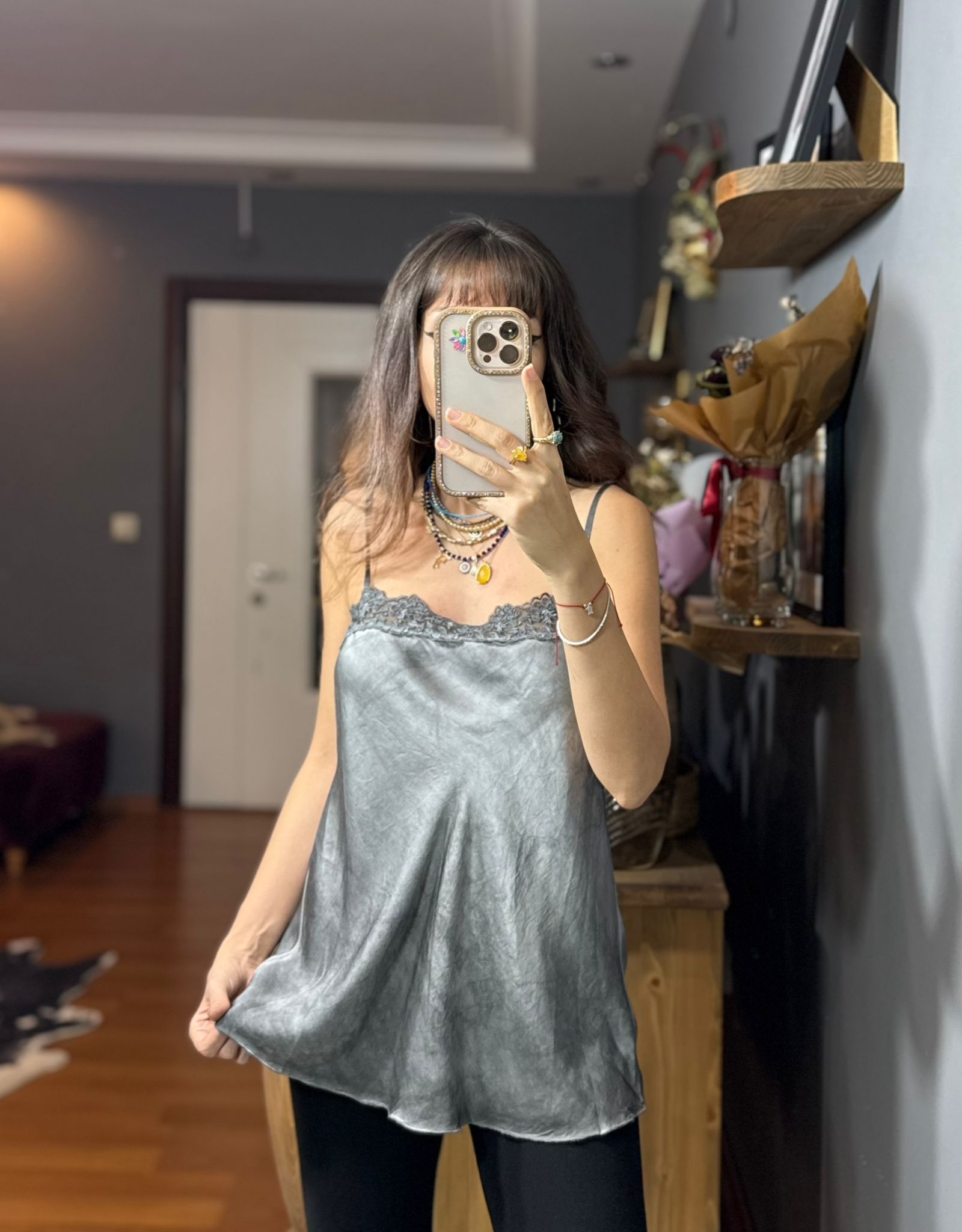 Dantelli İthal İpek Saten Askılı Bluz-gri
