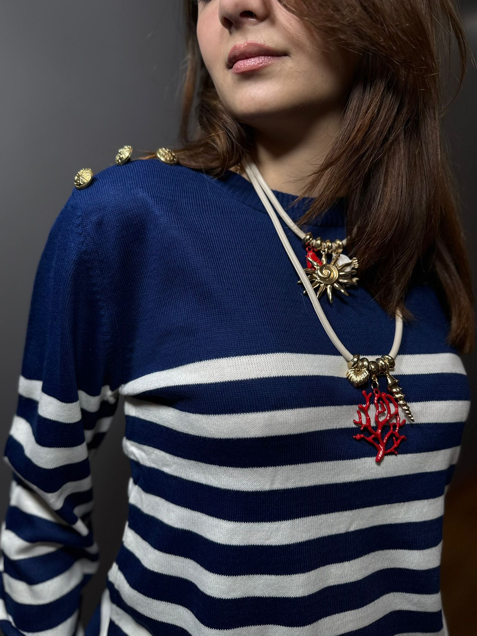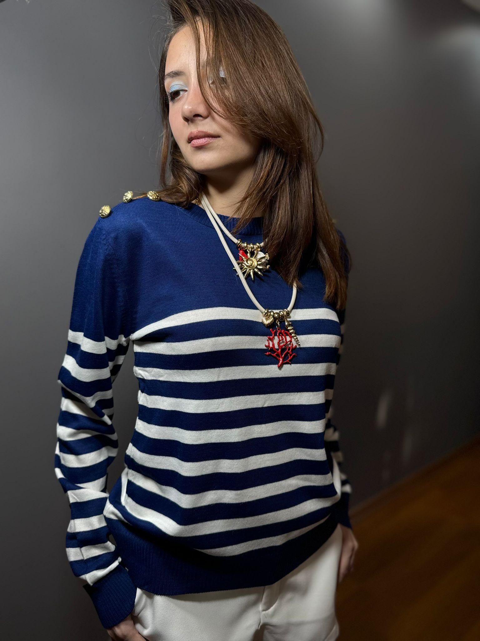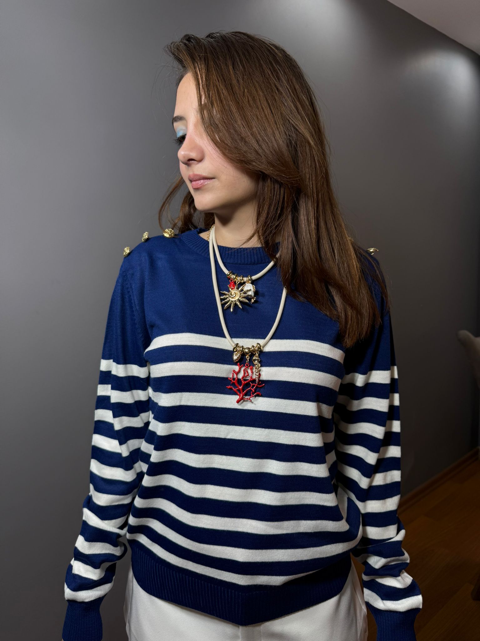 Gold Düğmeli Çizgili Triko. Klasik marin çizgiler ve lüks gold düğme detayları. Dört mevsim şıklık ve konfor sunan, gardırobun zamansız parçası. Hemen keşfet!