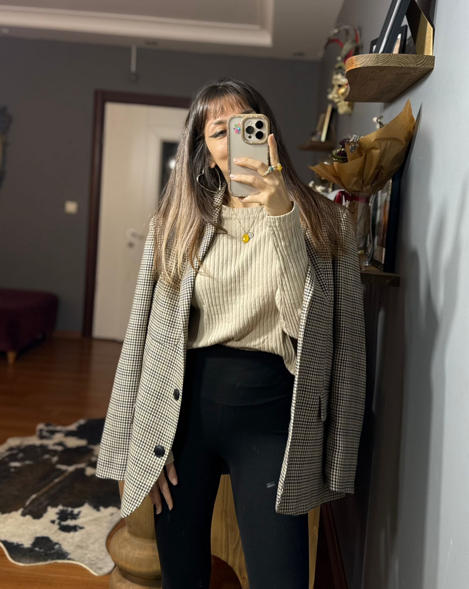 Ceketin rengi, özellikle siyah, ekru ve kahverengi tonlarıyla mükemmel uyum sağlayarak elegan kombinler oluşturmaya olanak tanır. Kıvrılmış ve desenli manşet detayı sayesinde, kolye veya bileklik gibi aksesuarlara ihtiyaç duymadan bile dikkat çekici bir stil sunar.