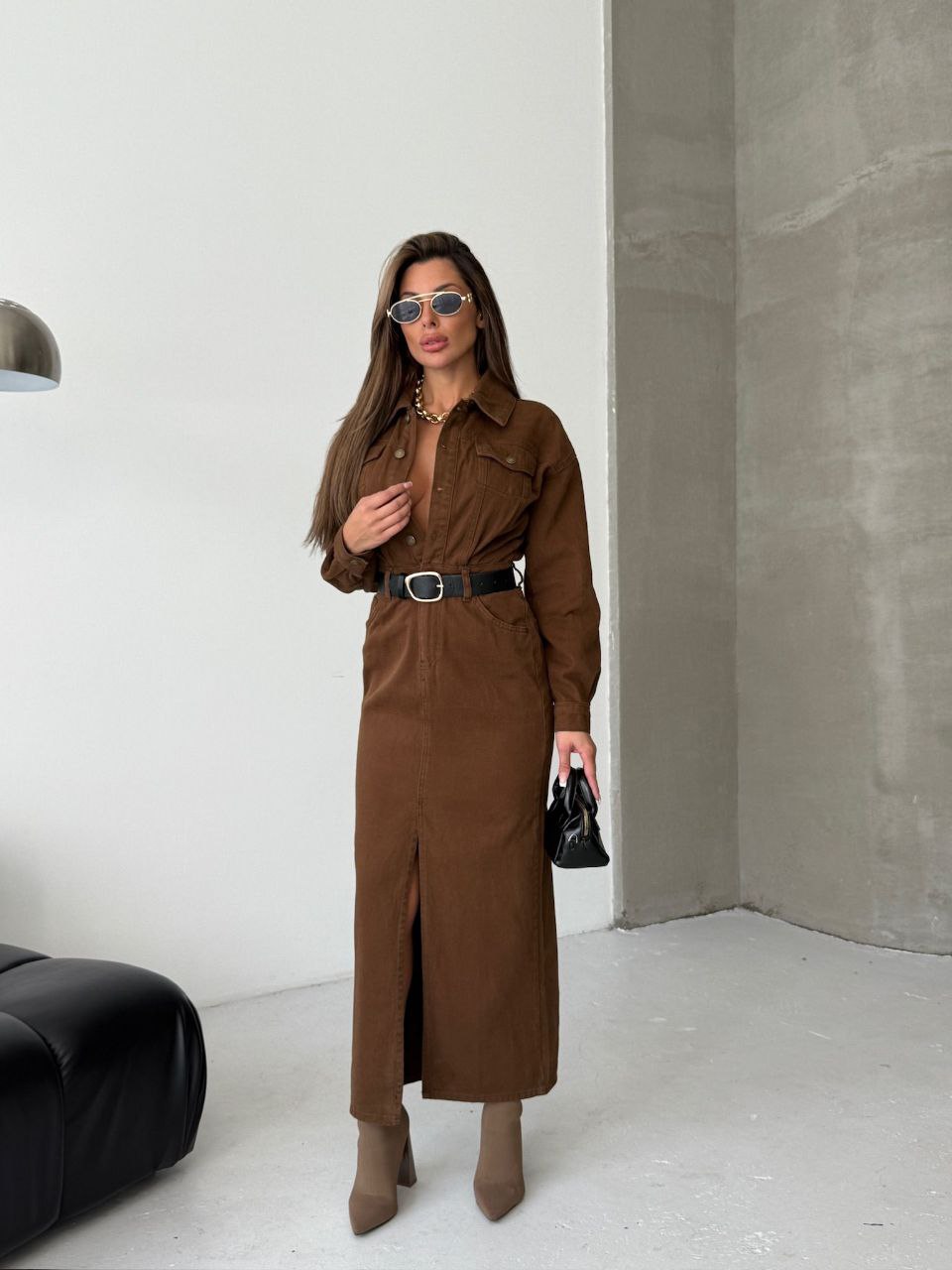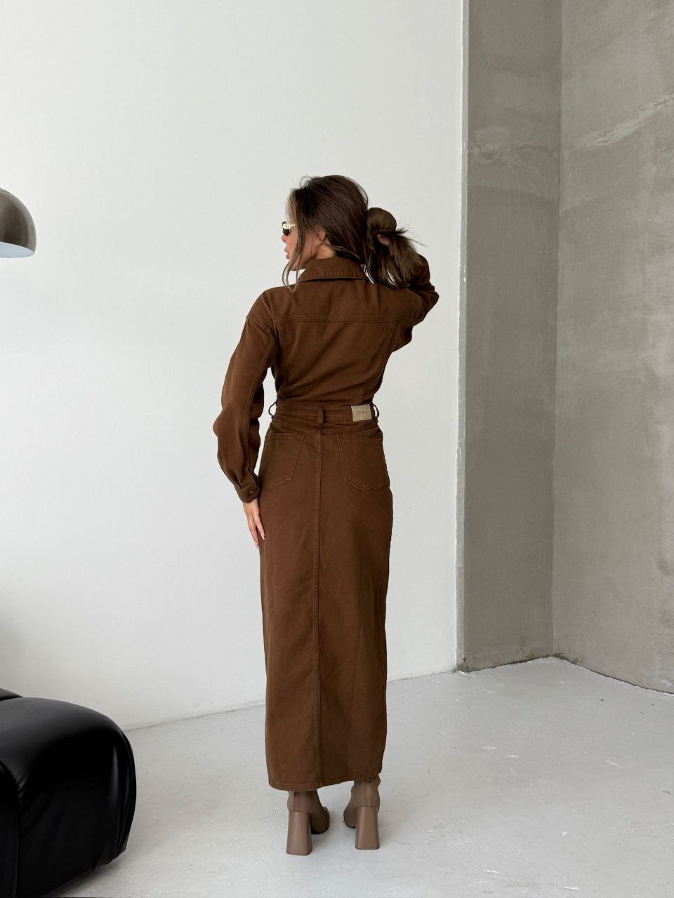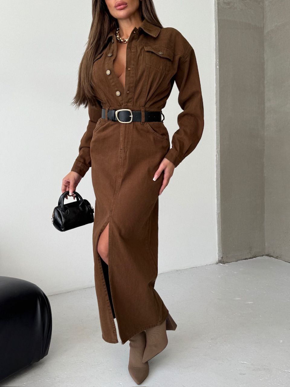 Önden Yırtmaçlı Maxi Boy Denim Elbise -kahve