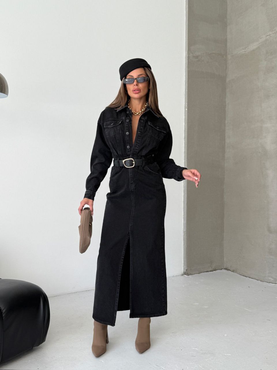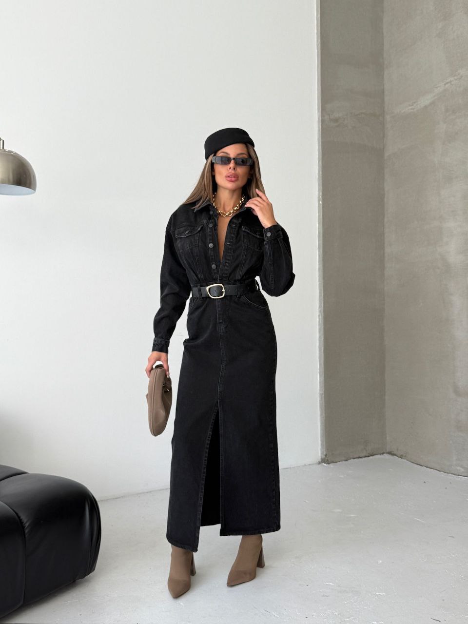 Önden Yırtmaçlı Maxi Boy Denim Elbise -siyah