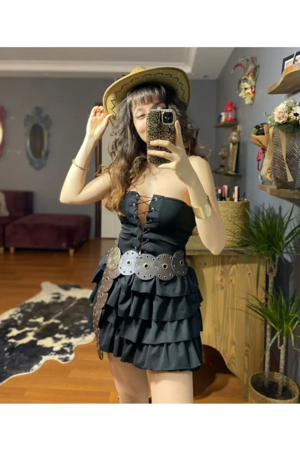 Mini boy kesimi ve volanlı pileli eteğiyle hareketli bir görünüm yaratır. Festival ruhunu yansıtan bu model; dans etmeyi seven, özgür kadınlar için ideal. Kumaşı esnek ve rahattır. S, M ve L beden seçenekleri sayesinde farklı vücut tiplerine uyum sağlar.