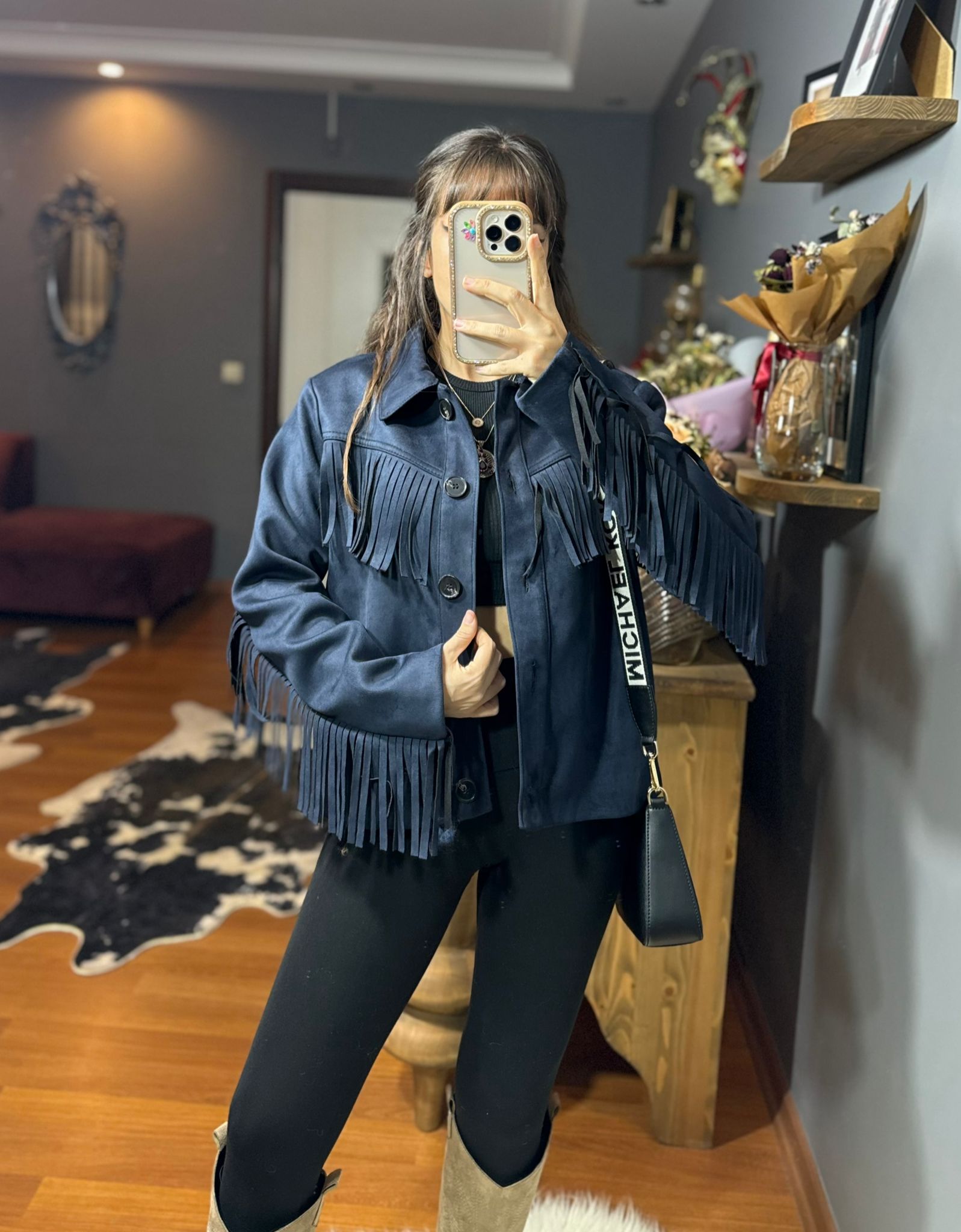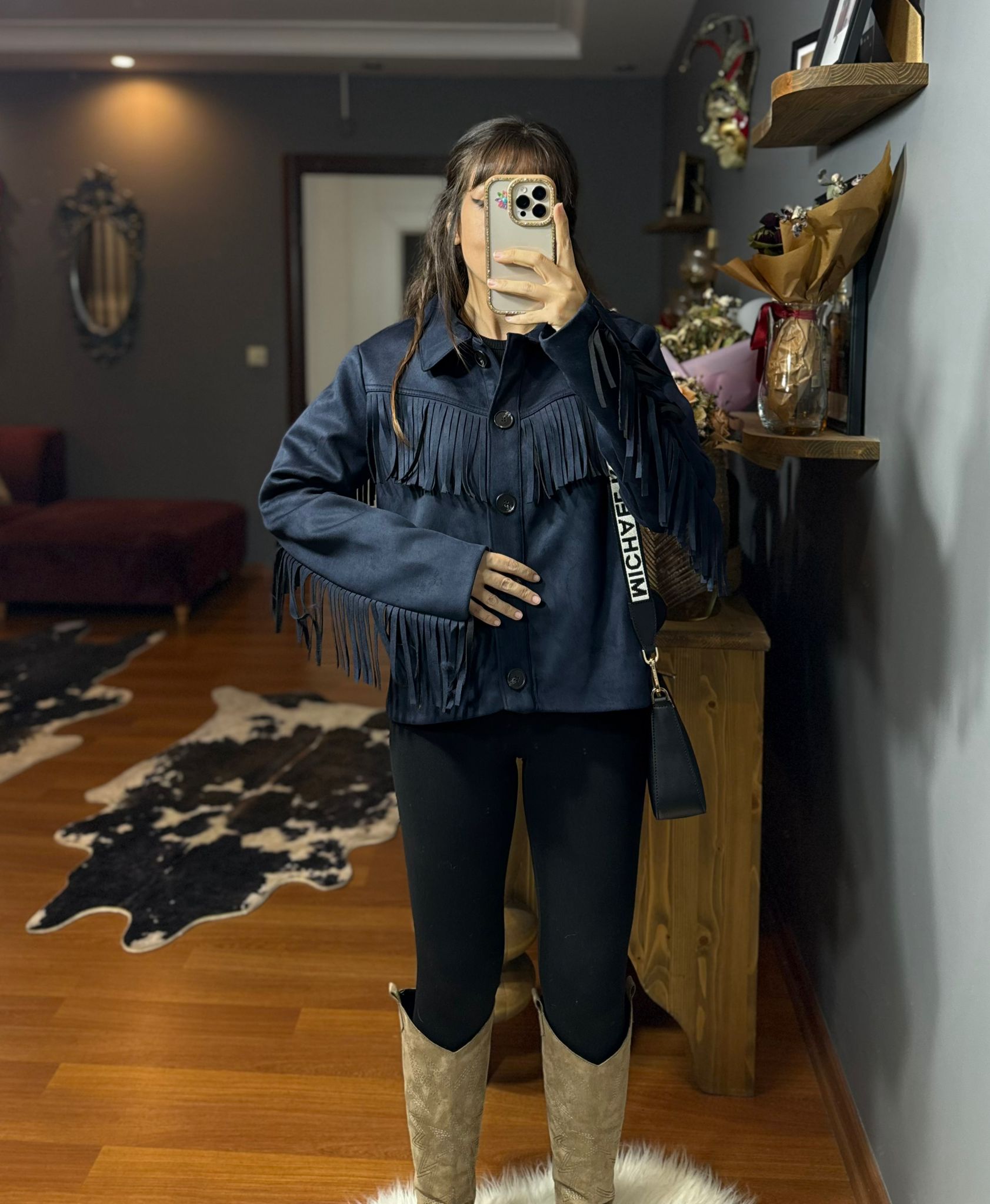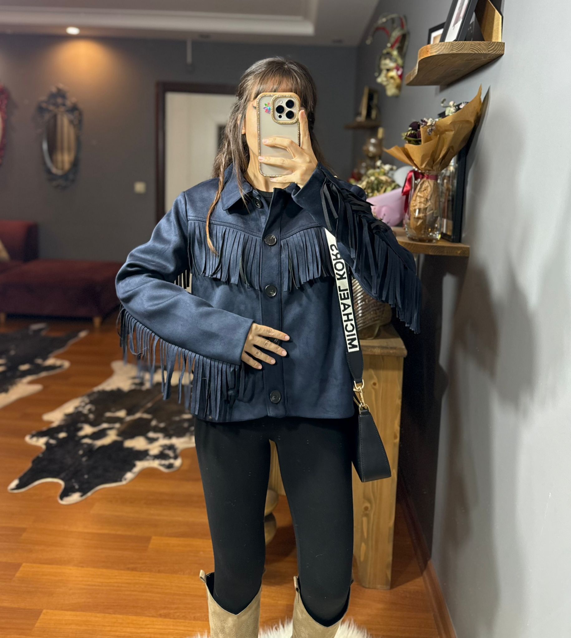 Püskül Detaylı Süet Kovboy Ceket – Western Stil – Lacivert