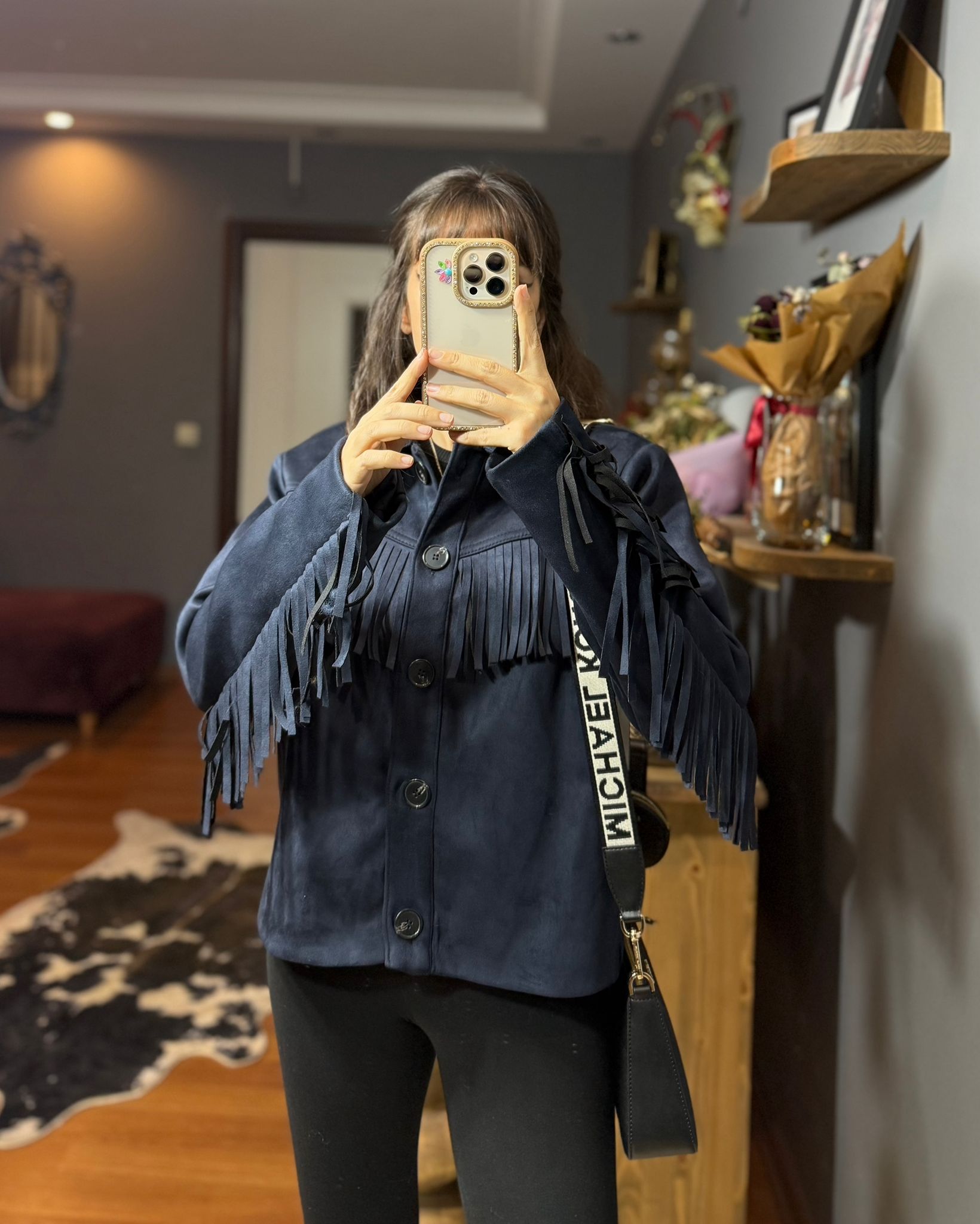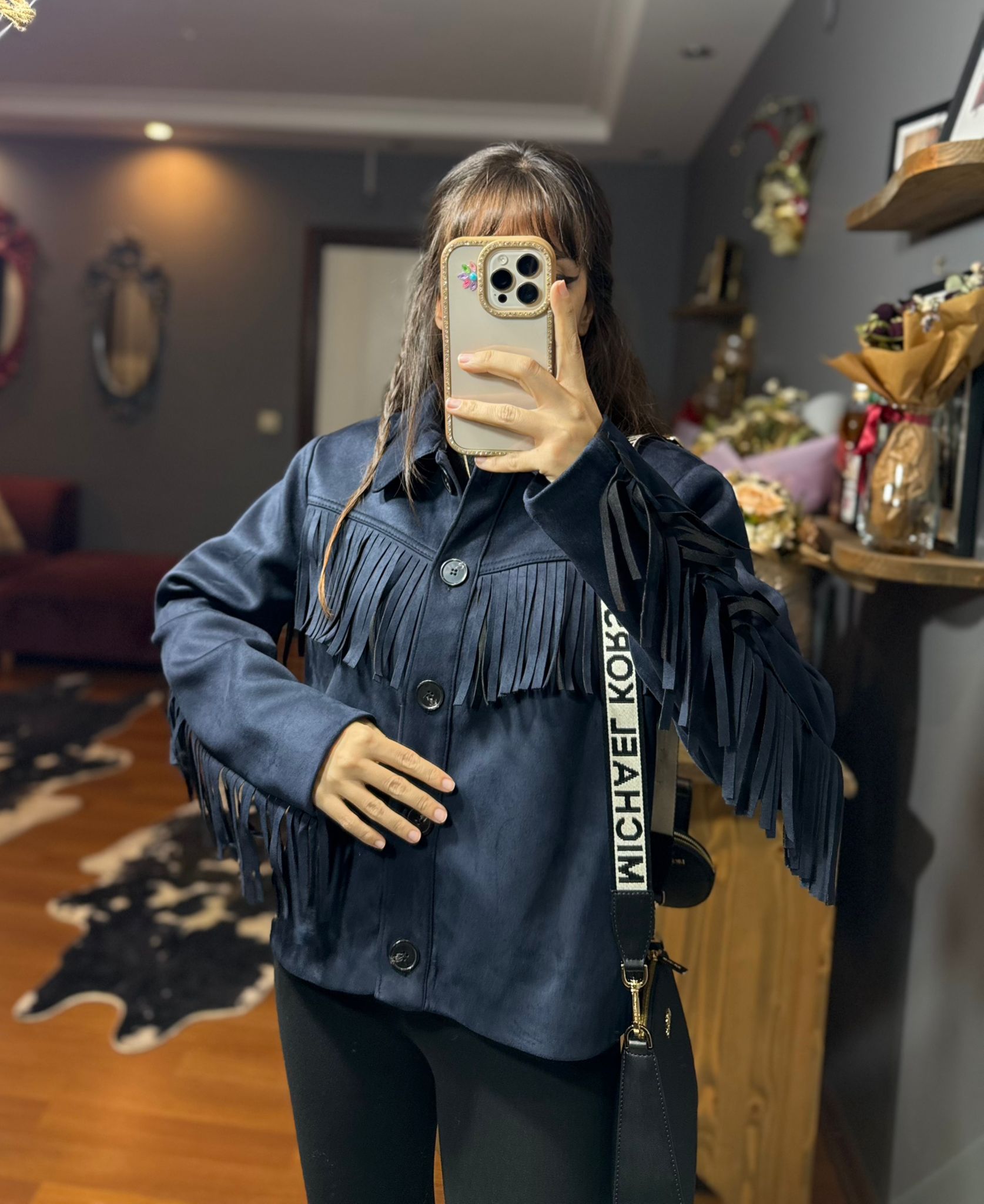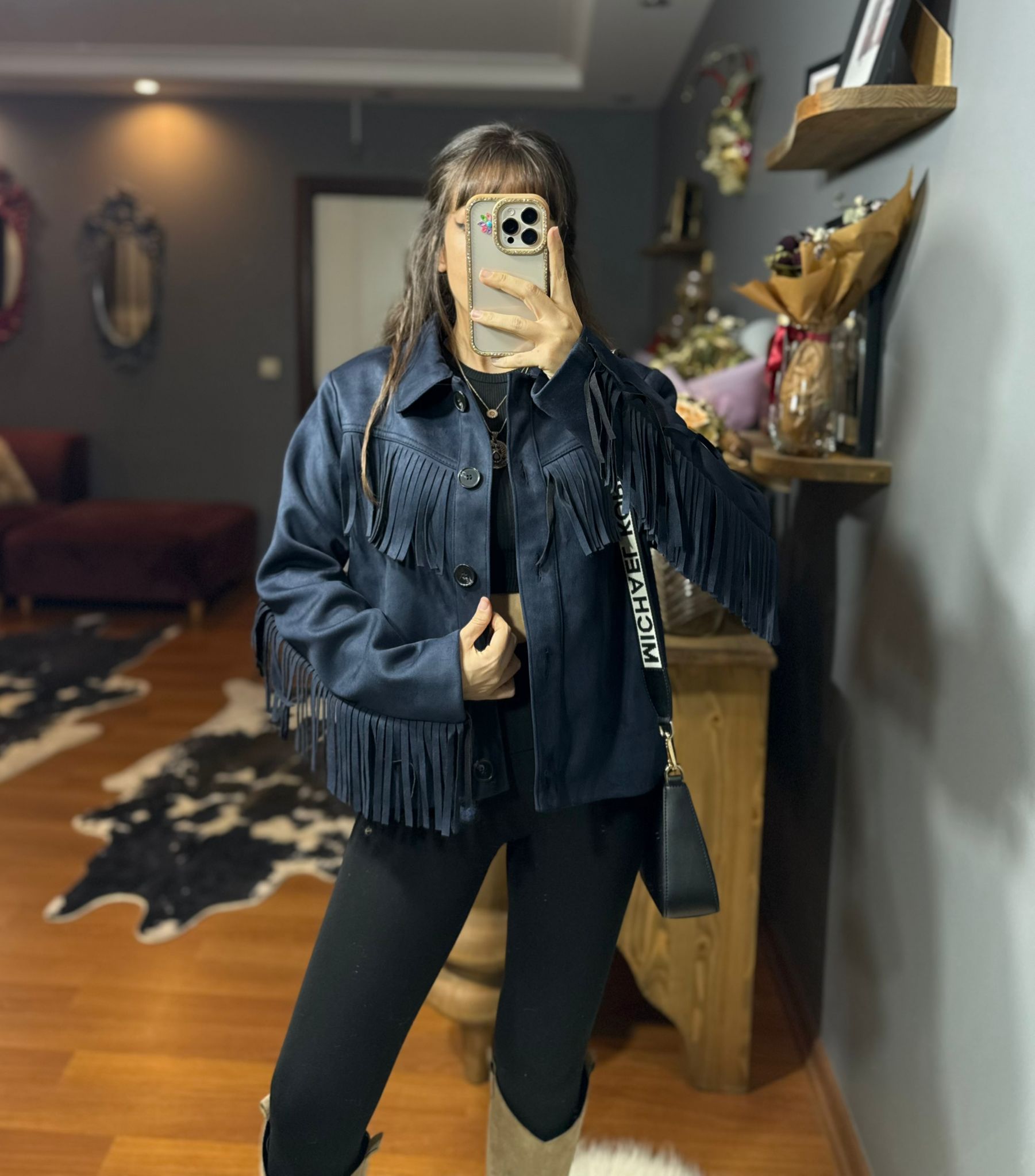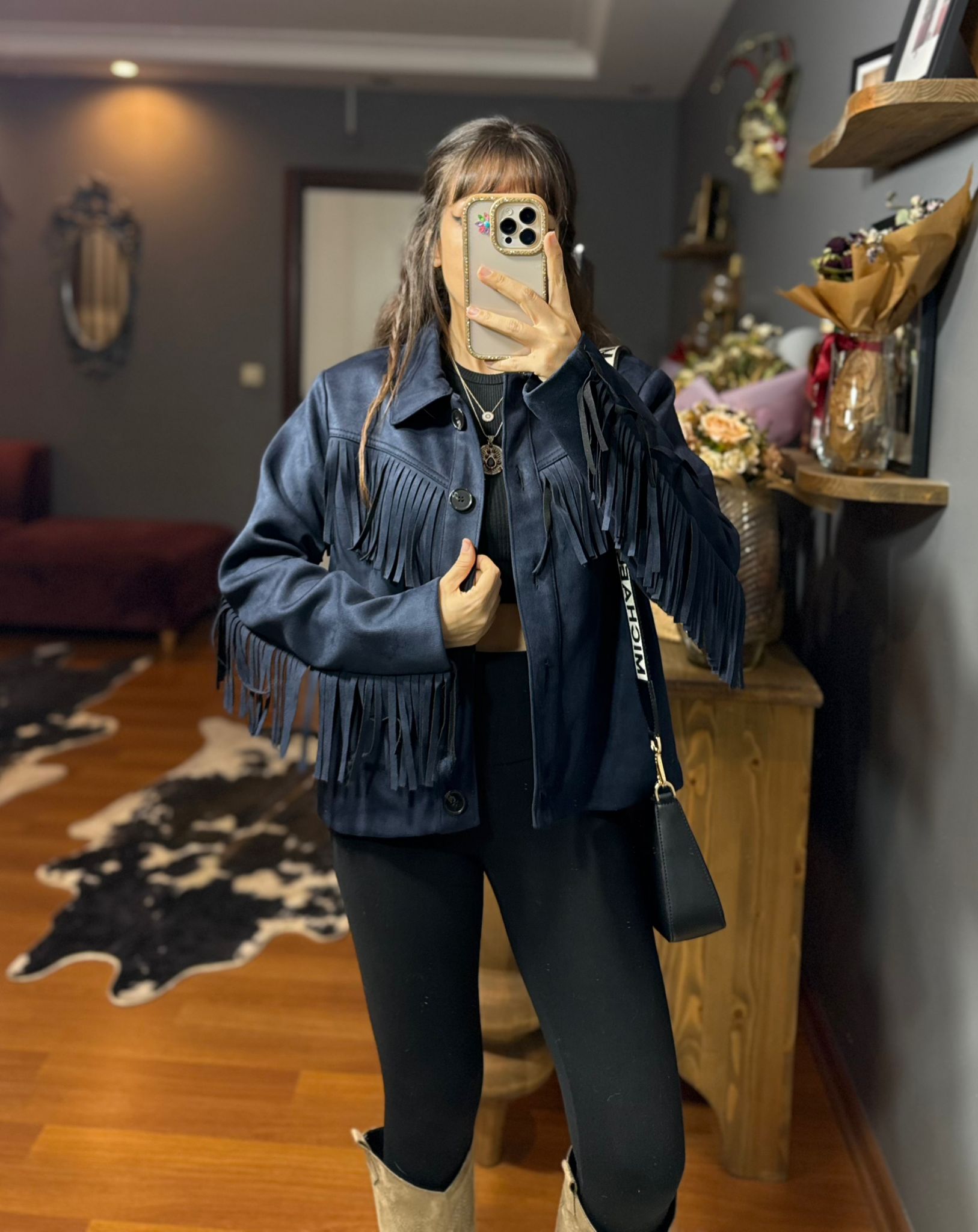 Püskül Detaylı Süet Kovboy Ceket – Western Stil – Lacivert
