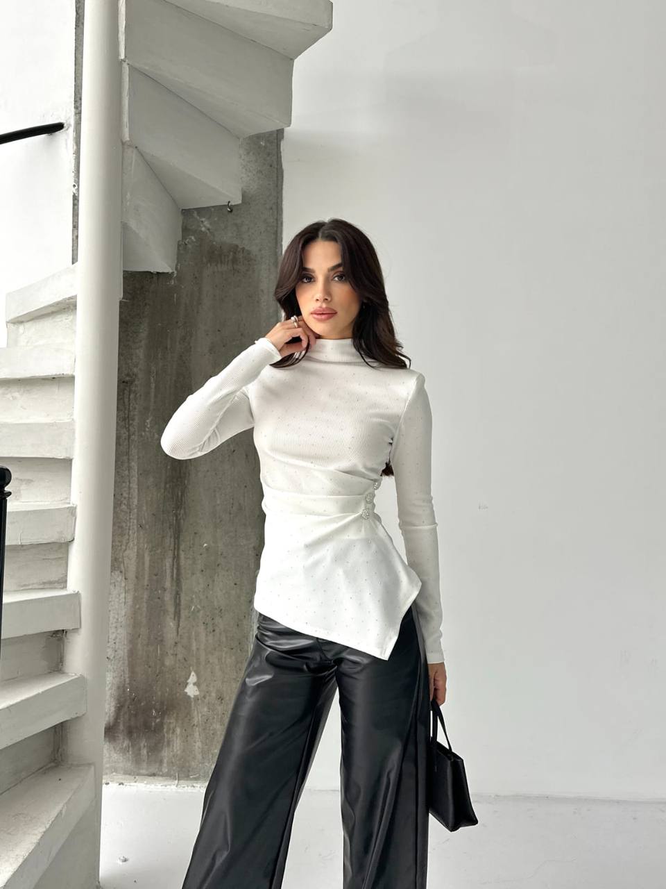 Bu özel tasarım asimetrik taşlı bluz, jean veya kumaş pantolonlarla rahatlıkla kombinlenebilir.