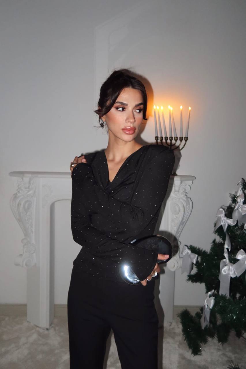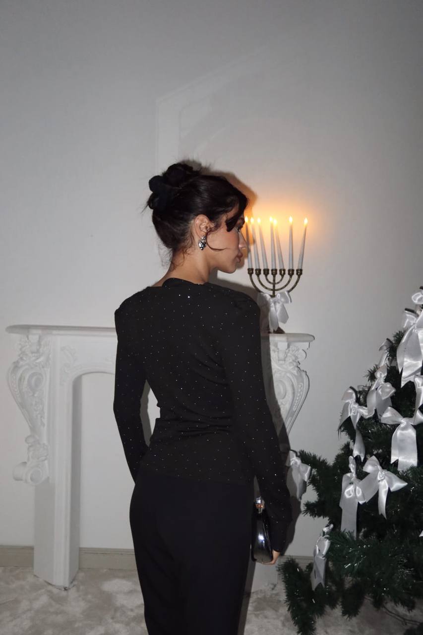 Bu taşlı bluzu dar paça pantolonlar, topuklu ayakkabılar ve minimal aksesuarlarla tamamlayarak etkileyici bir görünüm elde edebilirsiniz.